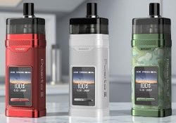 The Caliburn G2 Pod System Kit features vibrational interaction, progressive airflow adjustments, meshed coils for MTL or restricted DTL vaping, Pro-FOCS flavor tech, easy refills, draw-activated or button firing, 2ml juice capacity, and a 750mAh rechargeable battery.