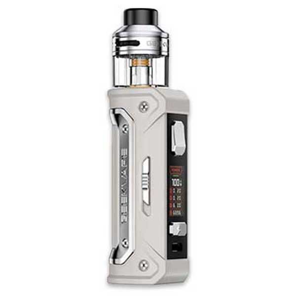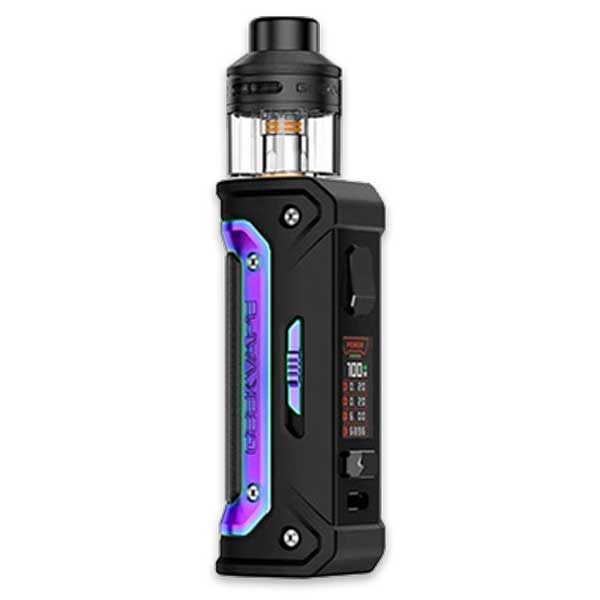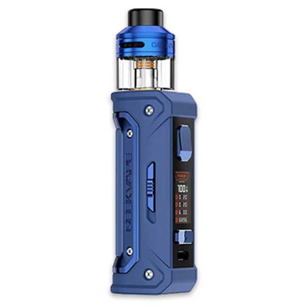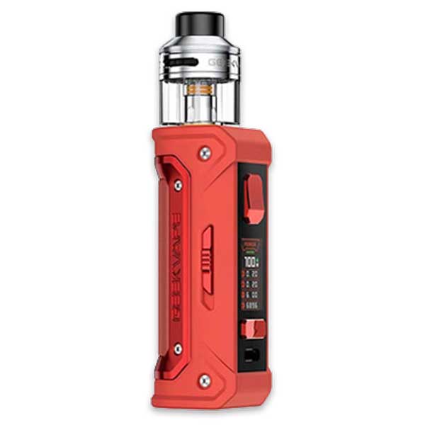 The Geekvape E100i is yet another device in the Aegis series of devices, but it appears this new setup is not waterproof. However, the appearance looks familiar with almost identical contours, a sliding lock also found in the Geekvape B60, exquisite metal buttons/accents, and a full-color display with intuitive vape data. The semi-gloss paint finish is available in volcanic grey, red, rainbow, black, beige, or blue.