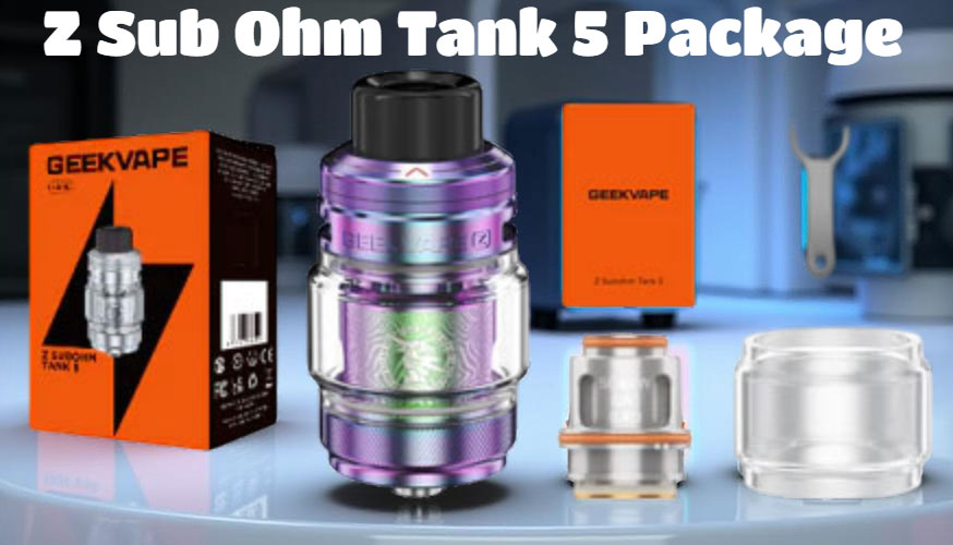 Everything you need is included in the box! The package features the Geekvape Z Sub Ohm Tank 5 (5.5ml), a large 7ml spare glass tube for maximum capacity, two powerful Z XM (Boost Version) coils (Z0.2 pre-installed and Z0.4 spare), plus a dedicated coil tool for quick, push-fit coil swaps.