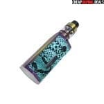 With dimensions of 45mm x 45mm x 88mm, this unit is very similar in size/form factor to the previous Ijoy Captain PD270 mod and is also said to be ergonomic. Available colors include black, silver, and rainbow, but the appearance is completely customizable thanks to several leather stickers. These are made with snake patterns: red/black, blue/black, yellow/black, or white/black. Also unique to this mod is the RGB backlights that are wave-like on opposite sides. The lights’ colors can be red, blue, green, white, and colorful. There is also an LED flashlight control button on the battery door in case you need a portable light.