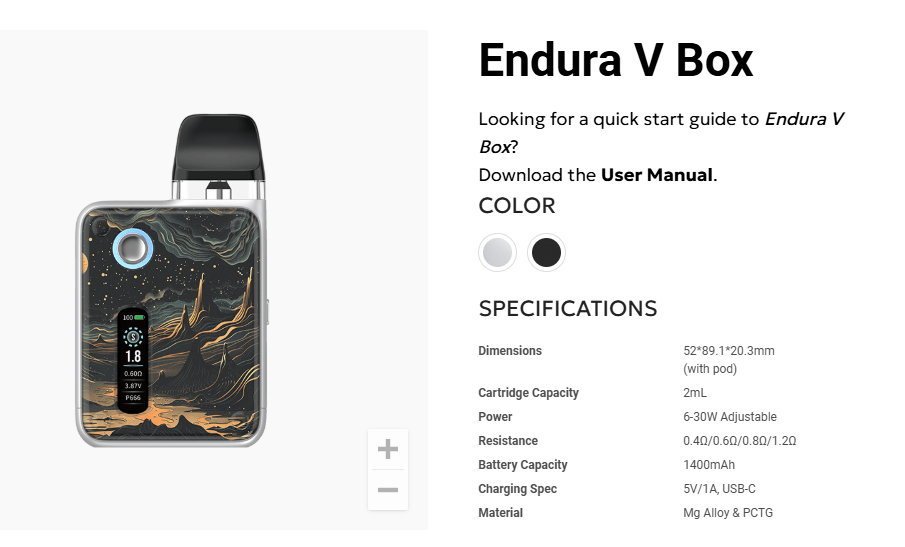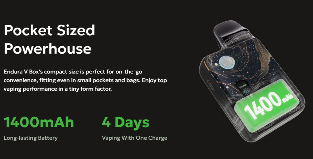 Innokin has earned its reputation for crafting reliable and effective user-focused vaping hardware. The Endura V Box continues this tradition, introducing a premium feel and advanced features with this compact pod mod. This sleek little device stands out immediately thanks to its durable magnesium alloy construction and a bright, feature-rich color screen, which are rare luxuries at this size. It delivers highly customizable power up to 30W, giving you incredible control over your vape experience. Overall, this device is the ideal solution for vapers seeking a major upgrade in features and battery life over basic pen-style systems, perfectly balancing portability and advanced performance.