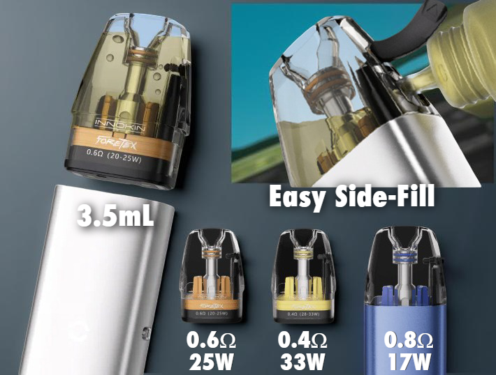 With a 3.5ml e-juice capacity and a mess-free top-side fill system, the Foretex further minimizes maintenance and maximizes your uptime. Utilizing Innokin’s latest mesh heating elements and optimized wicking materials, this kit delivers pure taste and consistent vapor volume across three distinct pod options, including a 0.4 ohm dual mesh version for those seeking a less restrictive draw.