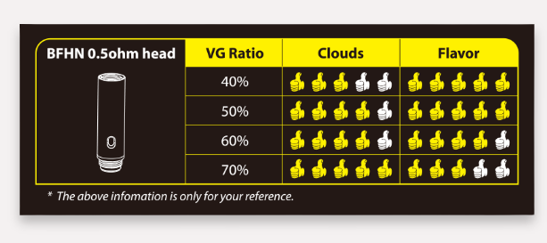 Designed to work well with the eGo AIO ECO starter kit, these BFHN 0.5ohm heads are perfect for nicotine salt-based or other high-nic juices. They are said to provide a mouth-to-lung vape and are easy to clean and install. And they operate with a 0.5ohm resistance for an output range of 6 to 8 watts while reducing power consumption so the battery mod can operate longer without a recharge.