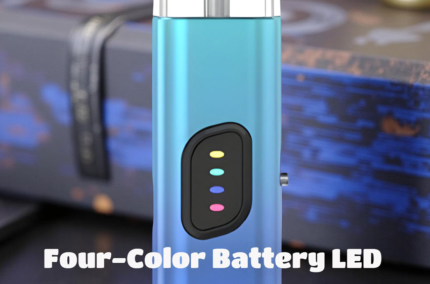 Close up showing the Smok Novo GO’s four-color LED light indicator, used to quickly display the current battery charge level