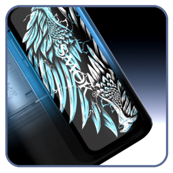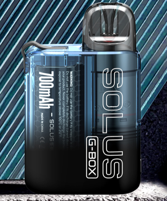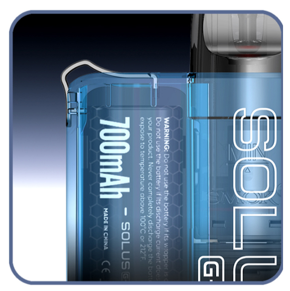 Design-wise, the Smok Solus G-Box Pod Kit is extremely portable and includes a Smok lanyard to carry the device around the neck. The appearance is modern thanks to a transparent chassis with an exquisite logo on one side and an eye-catching print on the other. There are seven color options: black, blue, red, green, pink, yellow, or purple.