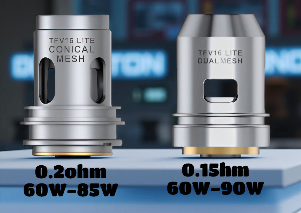 - 0.2ohm TFV16 Lite Conical Mesh Coil: Optimized for 60-85W, this coil uses nexMesh Technology and a conical shape to focus and compress vapor for a powerful throat hit.