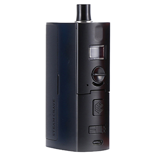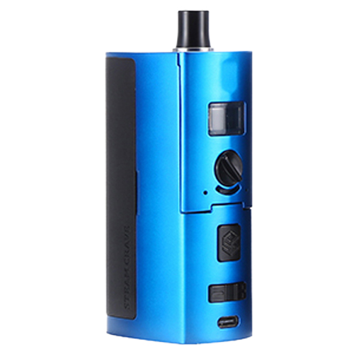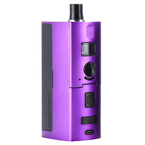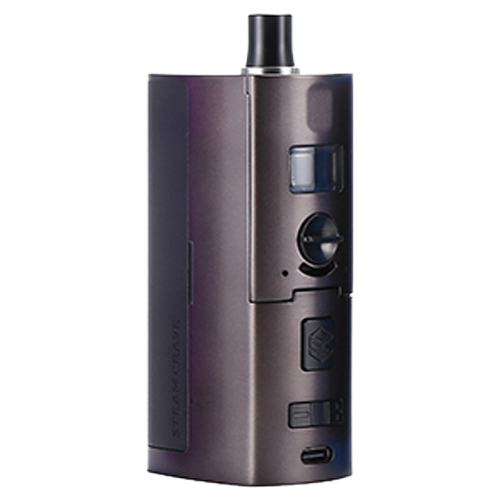 The Steam Crave Meson AIO Kit features a simplistic design, yet it looks exquisite thanks to curved corners and a small display screen. Two front panels are included in the package. This kit is made from zinc and aluminum alloys in blue, purple, black, red, or gunmetal.