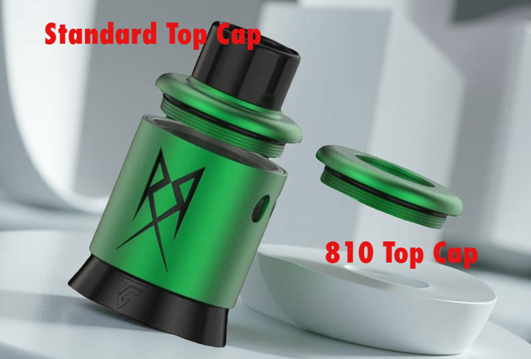 Tailor your draw and your style: The Thunder Cloud x GrimmGreen Recoil R3 Single-Coil RDA includes both the standard Recoil-compatible top cap (left) and a versatile 810 top cap (right). Whether you prefer the iconic feel of the original Recoil tips or want to swap in your favorite custom 810 wide-bore tips, this kit provides both options for total customization.