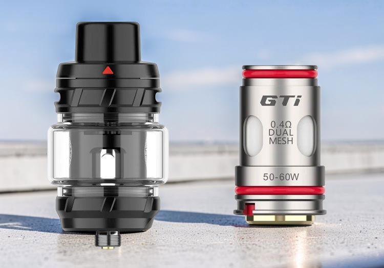 GTi 0.5Ω Mesh Coil: Smooth restricted DTL, 6ml capacity, 30W–40W.