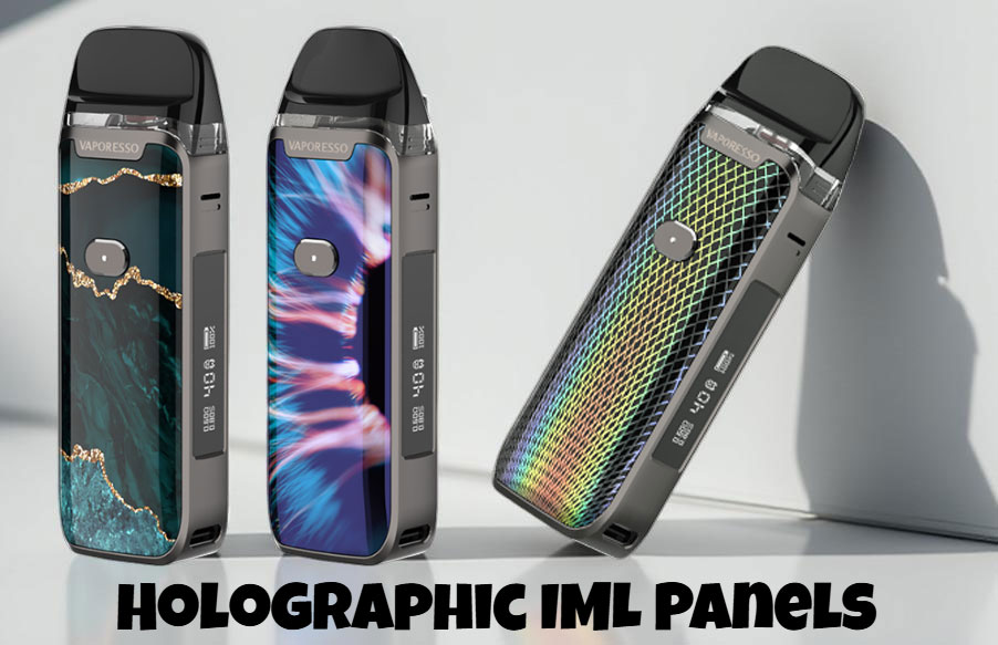 The PM40 achieves its upscale aesthetic through the use of Holographic IML Panels set into a solid, presumably Zinc-Alloy chassis. The IML (In-Mould Labeling) panels are the main feature, offering a deep, glossy sheen with a prismatic, iridescent effect that actively catches the light, delivering the “luxurious” look the device is named after. These unique panels come in several distinct finishes, such as Carbon Fiber (for a subtle, classic look), Lava (a vibrant red-black mix), and Jade or Silver (both known for striking rainbow holographic reflections), all of which elevate the PM40 beyond the simple, matte plastic found on standard pod systems.