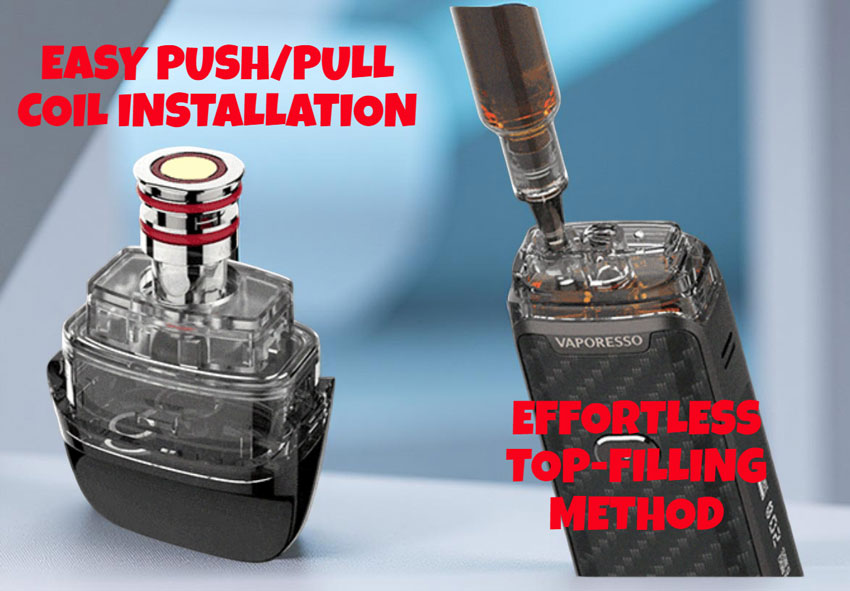 The push-pull coil system makes changes quick and clean, while the innovative clamshell top-fill cap means you never have to remove the pod to refill.