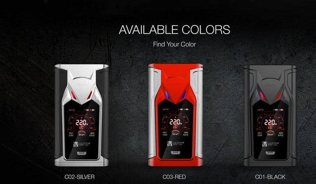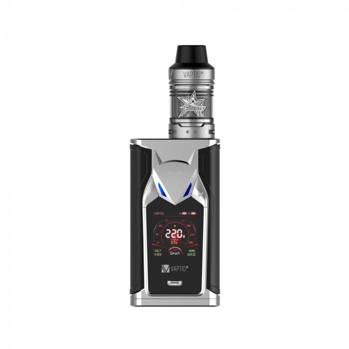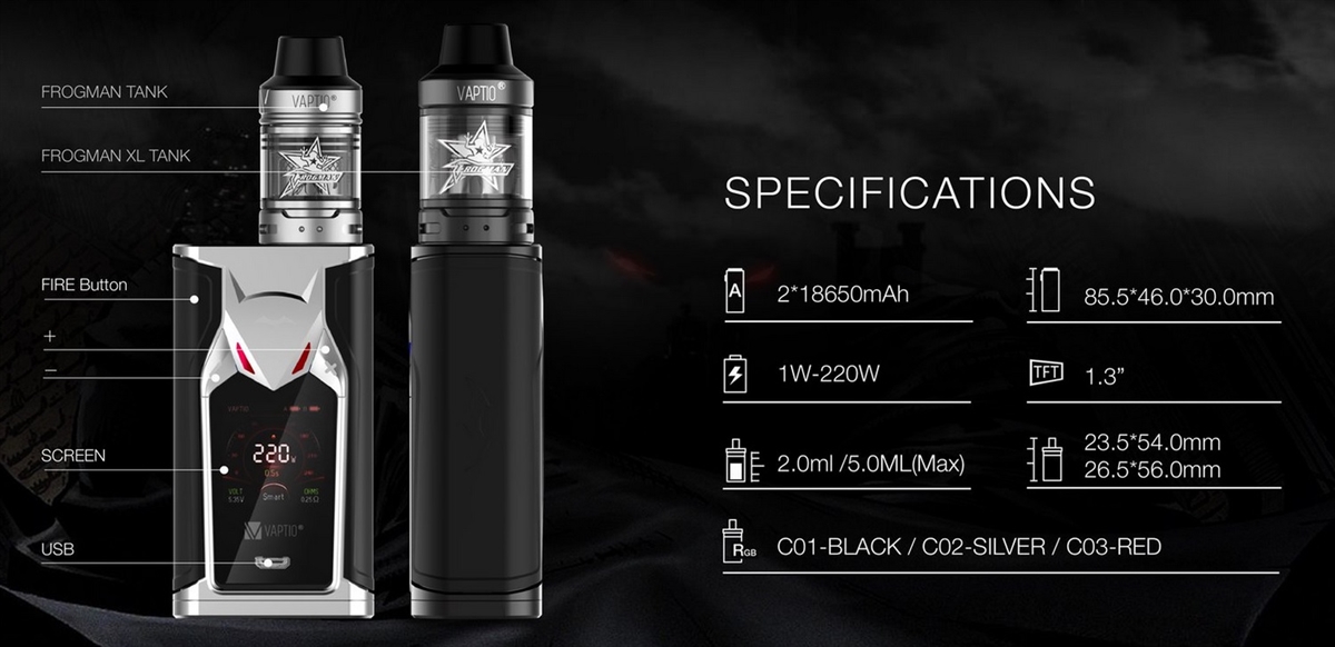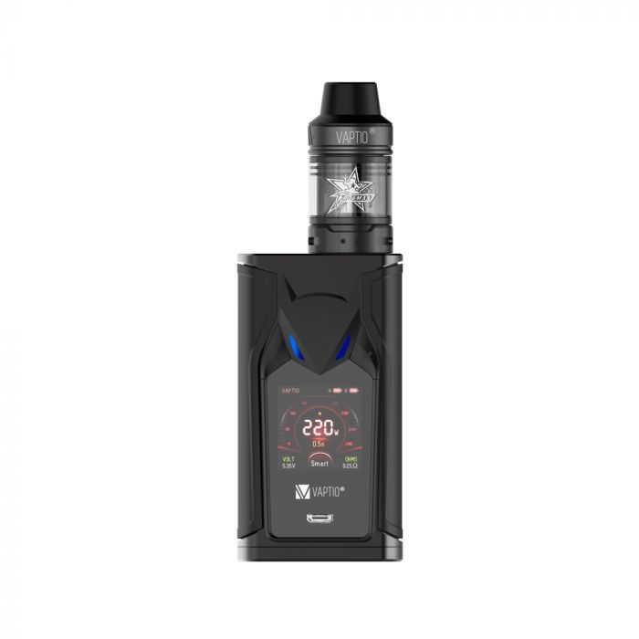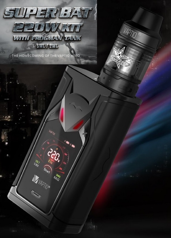 Here is a blowout deal for the Vaptio Super Bat 220W Kit.  This kit features a 1.3 inch TFT color display, 220 watts of power, a full temperature control suite with CCW & CCT modes (curve modes), dual 18650 batteries (not included), easy bottom battery access, a tank with 5ml juice capacity, a top fill system, dual adjustable air inlets, and Frogman coils.
