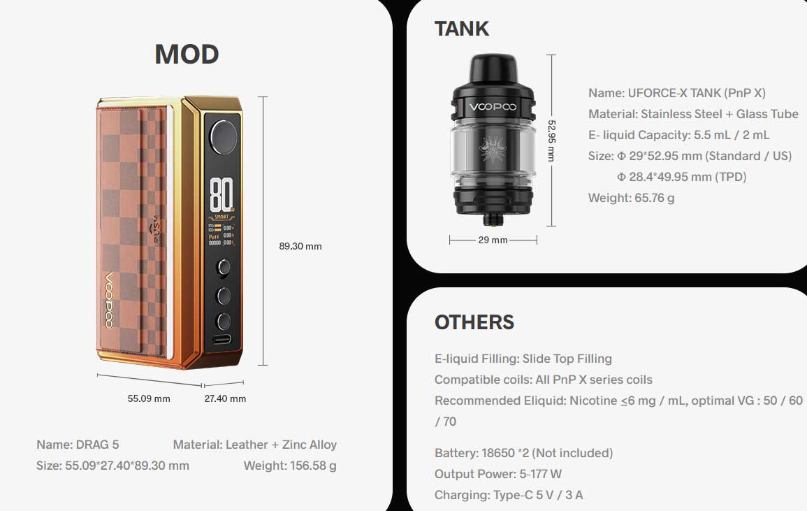For the full Drag 5 Kit, VOOPOO pairs this mod with the 5.5mL UFORCE-X Tank, a leak-resistant atomizer that features top-located airflow to funnel vapor straight up, providing a clean, intense flavor experience with the PnP X coil platform. This combination of massive power, smart safety features, and premium build quality has solidified its position in the market.