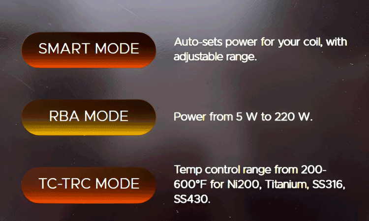 Three specialized power modes allow you to automatically optimize your settings, unlock the full 220W potential for custom builds, or maintain a consistent temperature for a perfectly tailored draw every time.